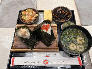 やさしくふんわりにぎられたおむすびとたくさんのお惣菜たち