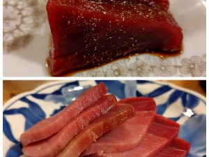 山口の天然マグロ、山椒を添えて(上)、生マグロ、塩や醤油で(下)、美味すぎる😆✨