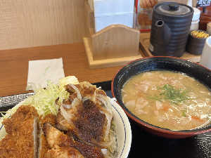 親子丼の上にロースカツが乗った限定。ソースではなく出汁による味付けで、ご飯が進むものでした。