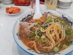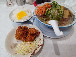 ラーメン、ライス、たくあん、キムチ食べ放題。唐揚げ2個税込み950円、駐車場有り、