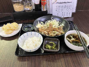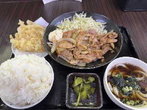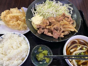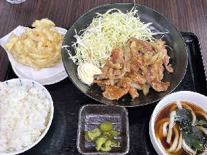 生姜焼き定食食べながら、玉ねぎ天とうどんは、斬新過ぎる🤣この生姜焼きも好きなタイプで、旨し