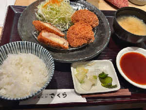 エビフライ、アナゴフライ、ヒレとボリュームある定食。 ご飯は釜焚きらしく陶器のお釜でおこげ付き。良き