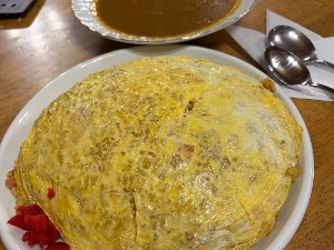 カレーピラフオムライスにカレーがかかった名物 朝がガッツリだったので昼飯抜きでもなんとかなった