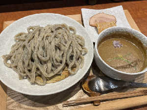 御影石のような胡麻が練り込まれた極太麺。 ドロドロつけ汁は何回でもスープ割りできます。