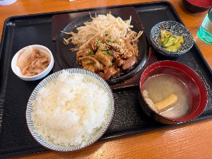 焼いたもつともやし。鰹節で味変。ごはん味噌汁おかわり可能。