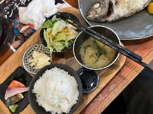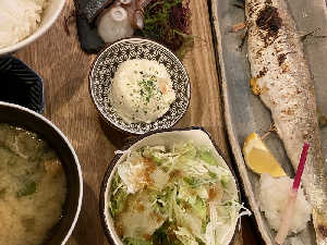 カマス🐟ラストワン😆塩焼き、いえーい 尾花さんの刺身、塩で食べてもおいしい。ランチでも高品質。