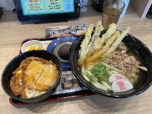 ミニ天丼&大盛うどんでわんぱくセット。深夜のうどん、ラーメンよりは罪悪感がない摩訶不思議🙃