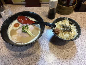 鶏白湯+醤油ラーメン。卓上の「にぼ酢」という魚介酢が〆にぴったりで美味しかったです😋