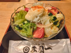 シャキシャキ野菜にマヨネーズ。下からうどんと和風出汁。不思議な出会いは旨さ必然!