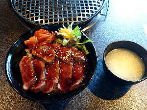 日高こんぶ配合のエサを食べて育った黒毛和牛で、こぶ黒とのこと 焼肉丼1300円でご飯大盛り無料大満足
