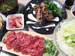 希少部位、鮪頬肉の筋を取り刺身で食べた🐟激ウマっ! 半分はレア焼スパイス風味🐟 かしわめしも炊いた👨🍳