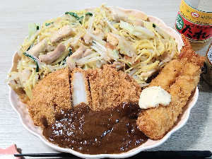 白菜と豚肉の塩焼きそば・カレー炒飯・焼き焼売・キャベツサラダ・目玉焼きとお新香をごちゃっと盛った!