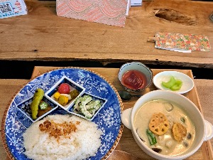 フライドオニオンの乗ったおこわ。ブドウのゼリー、ゴーヤのマヨネーズ和え、セロリの漬物。美味しかった。