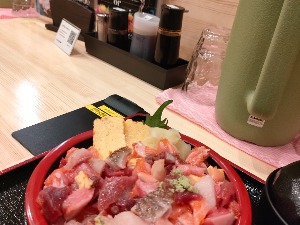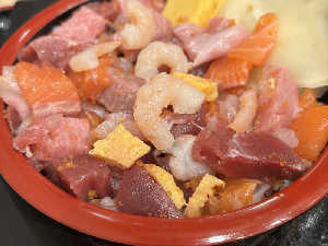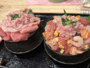 土日祝限定ミニ海鮮丼2つで1,200円と爆安。シェアOKです