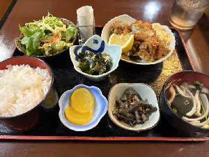 タルタル付きの唐揚げに、小鉢も数皿あって、かなりうれしい。