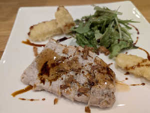 新冠黒豚のトリュフ風味ソテーととうもろこしの天ぷら