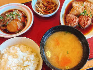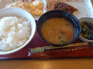 めしと豚汁に具沢山のオムレツ、さっぱり酢の物、アジフライはソースたっぷりで超満腹。