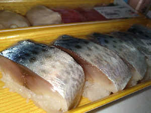 見て!この肉厚なサバ! これがワンコインよ💟 他にホッキとマグロの握りも購入〜🤗