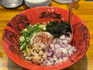 太麺でワシワシ。生玉ねぎがいいアクセントだけどちょっと辛い。残ったタレはミニネギチャー丼にかけて満腹