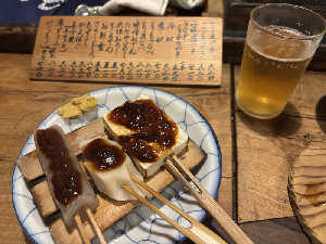 醤油ベースの出汁に、豆腐、玉葱、鶏モツ、薬味に葱。櫻正宗熱燗と共に。