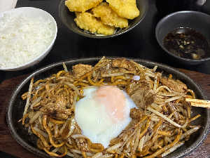 日田焼きそばにご飯味噌汁とり天までついて1000円 温玉追加して+100円 良心的すぎる