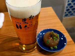 生ビール、レバー刺し、刺身盛り合わせ、生牡蠣、自家製塩煮込み、牡蠣ラーメン