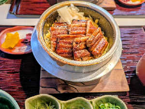 釜炊きの出汁ご飯の上に焼きあなご。美味しい。 店の雰囲気もいいし、値段も高くないし、とてもよろしい。