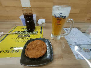 ショーケースは無いが、呑みカウンターはある精肉店。揚げたてのハムカツとビールだよ🥰
