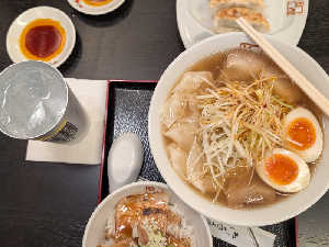 ラーメン、タレたっぷり焼豚飯。安定のうまさ。