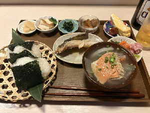 塩おにぎり2個、三平汁、小鉢5品、ミニお刺身、本日の魚で1,700円。塩おにぎり2個おかわり無料。