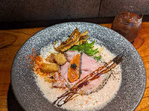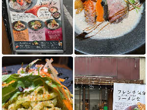 なんだか新鮮味たっぷりの一丼🍝 もちもち麺にサーモンの風味際立つスープ、 歯ざわり楽しい揚げ物文字数