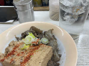 ちょっとクセのあるフワの煮込みとアツアツの豆腐に一味をたっぷりかけて。