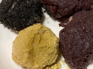 あんこと胡麻、きな粉の全部盛り。甘過ぎない絶妙なバランスで美味。何個でも食べられそう( ´▽`)