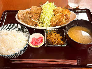 唐揚げと生姜焼きがハーフ&ハーフ!唐揚げ大きくて美味しい 夜定食のお店(21:30LO)