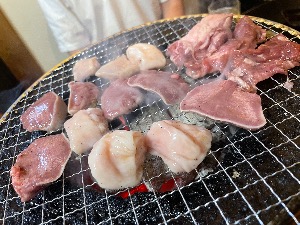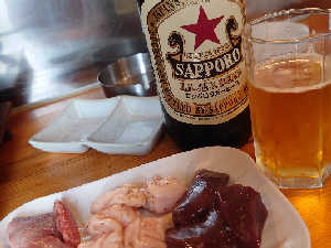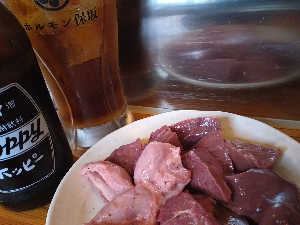 黒ホッピー、3種盛り(ほほ、はつもと、レバー)ハツ