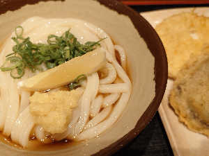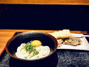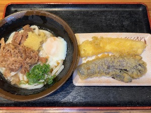 牛肉温玉ぶっかけうどん冷(大)+なす天/いか天