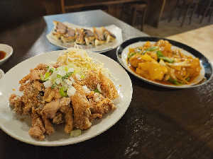 油淋鶏はカリッとジューシー。 酢豚は甘酢餡に絡む豚肉とタケノコの歯応えが👍ニラの旨味溢れる餃子も美味