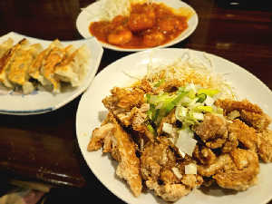 サクッとジューシーな油淋鶏、初め甘め後からピリ辛のエビチリ、具沢山の餃子、どれも美味です。