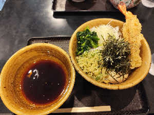 ラー油が効いた汁が絶品。蕎麦も硬めで山形蕎麦っぽさがある。えび天美味すぎた😋