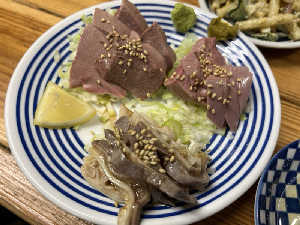 厨房の連携プレーを見ながら 生姜のすりおろしチューハイ。 ガツ刺、はつ刺、トロレバ刺。 美味いっす。