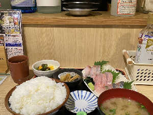 本日マダイ、スズキ、サーモン🐟 ご飯大盛無料で小鉢・サラダ付🥗 味噌汁も美味👍これで1k以下は嬉し🉐