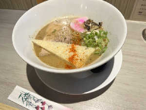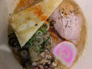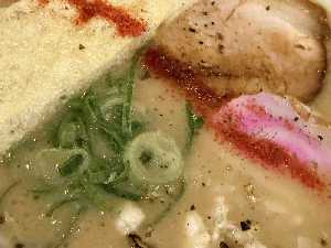 甘い味噌の後口が香る鶏白湯。うまい。特製トッピングには「葱」もあったはずなんだけど…どこ??