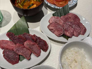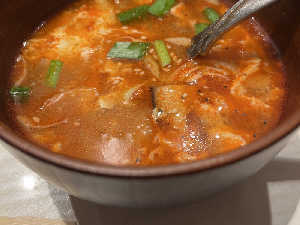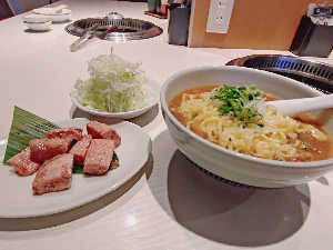 サウナ受付で受け取ったチケットで ユッケジャンスープに変更 お肉の焼き加減がちょうどよい