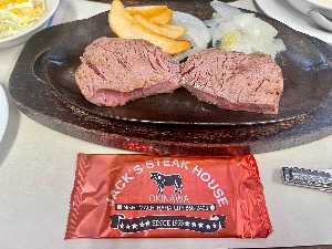 沖縄ステーキの中でもレベチで断トツのナンバーワンです。レアを頼むと真っ赤な肉が出てきます。