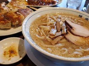背脂と煮干しのWスープが極太手打ち麺に絡んでとても美味しい!餃子は特大!