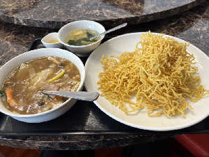 海鮮とカシューナッツ炒めと酢豚のセットに三種の揚げ物と天津飯。食べきるのは難儀。