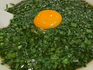 一面を覆いつくす新鮮なニラとアツアツに熱したゴマ油の香ばしさがクセになる