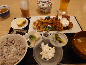 白米と十穀米が選べます。今回のデザートはライチでした。また、明太子食べ放題サービスがついています。