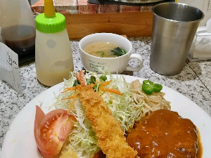ハンバーグは分厚くて、肉感がありうまい。 えびフライもでかい。1,110円はコスパよし