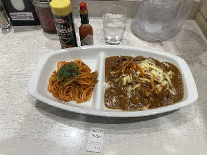 サ活前に激辛カレーで元気を補給🍛チーズでマイルドになっててナポリタンもありボリューム満点でゔんまい😋